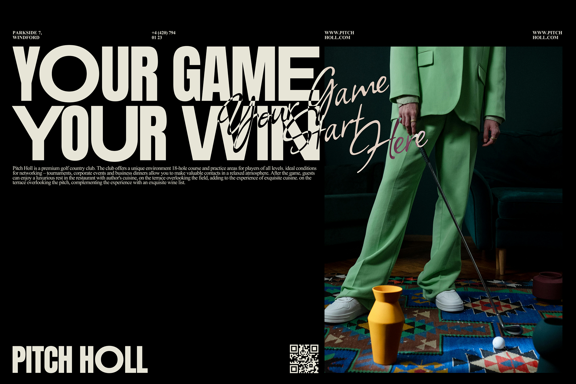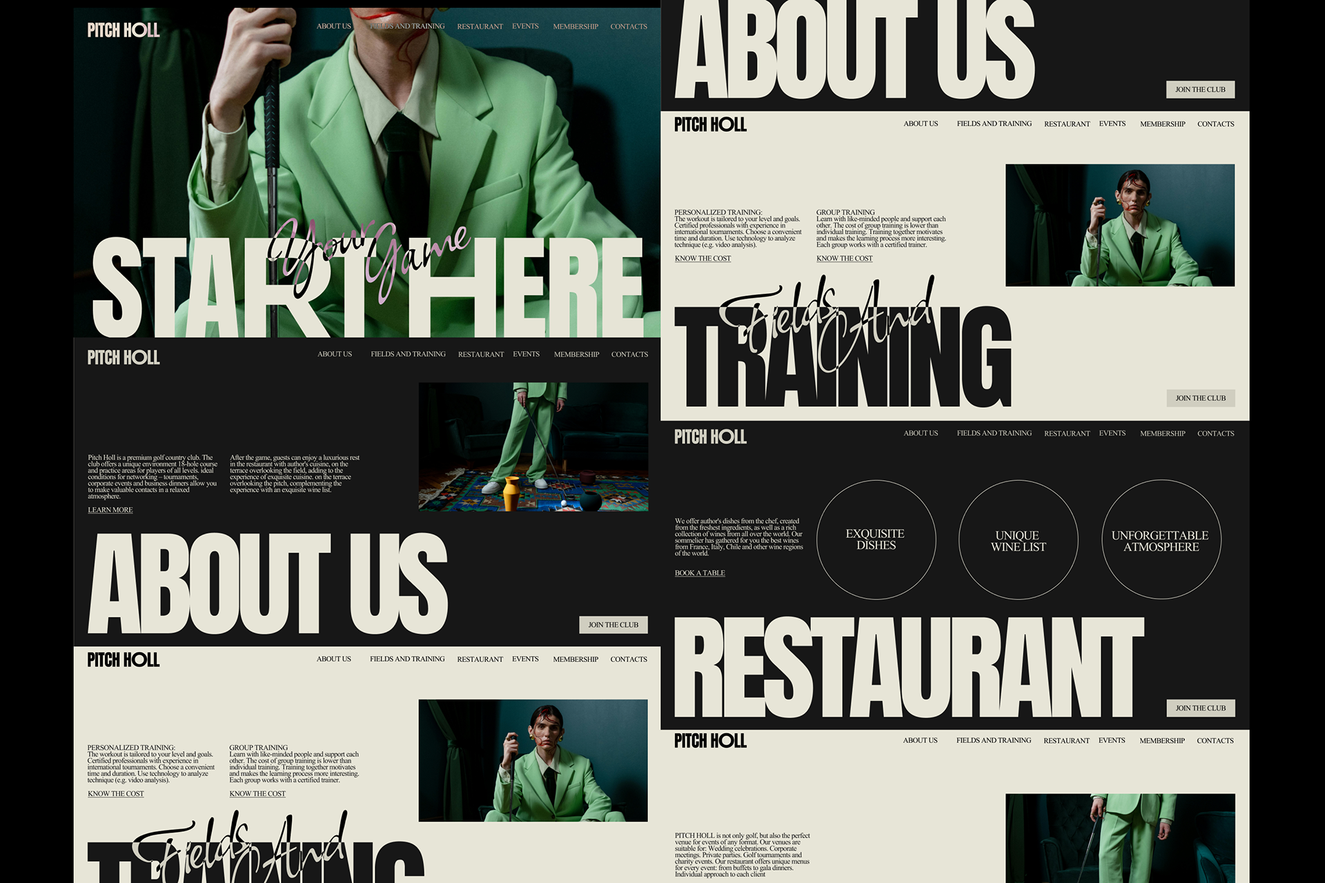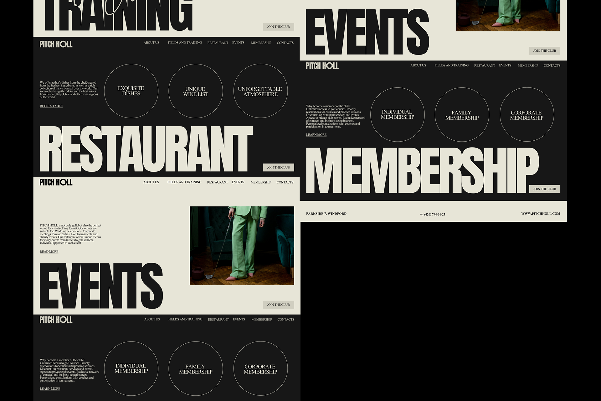 Название Pitch Holl идеально отражает суть гольфа. ПИТЧ — короткий удар, символизирует мастерство, и ХОЛЛ — лунка как цель, к которой стремится каждый игрок. Визуальный стиль был разработан с акцентом на мощную запоминающуюся типографику. Крупные, выразительные шрифты передают уверенность и энергетику игры. Темно-бежевая палитра подчеркивает премиальный характер клуба. Крупные надписи на упаковке сразу привлекают внимание и делают бренд легко узнаваемым. Мы решили сделать сайт клуба простым и интуитивно понятным, сделав акцент на крупной типографике и минималистичной навигации.