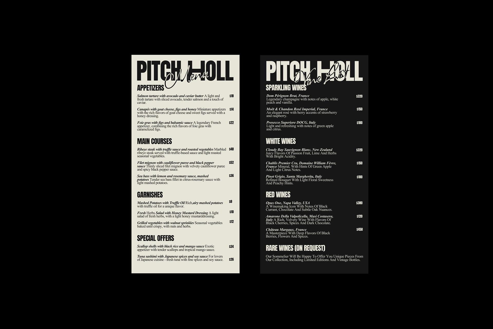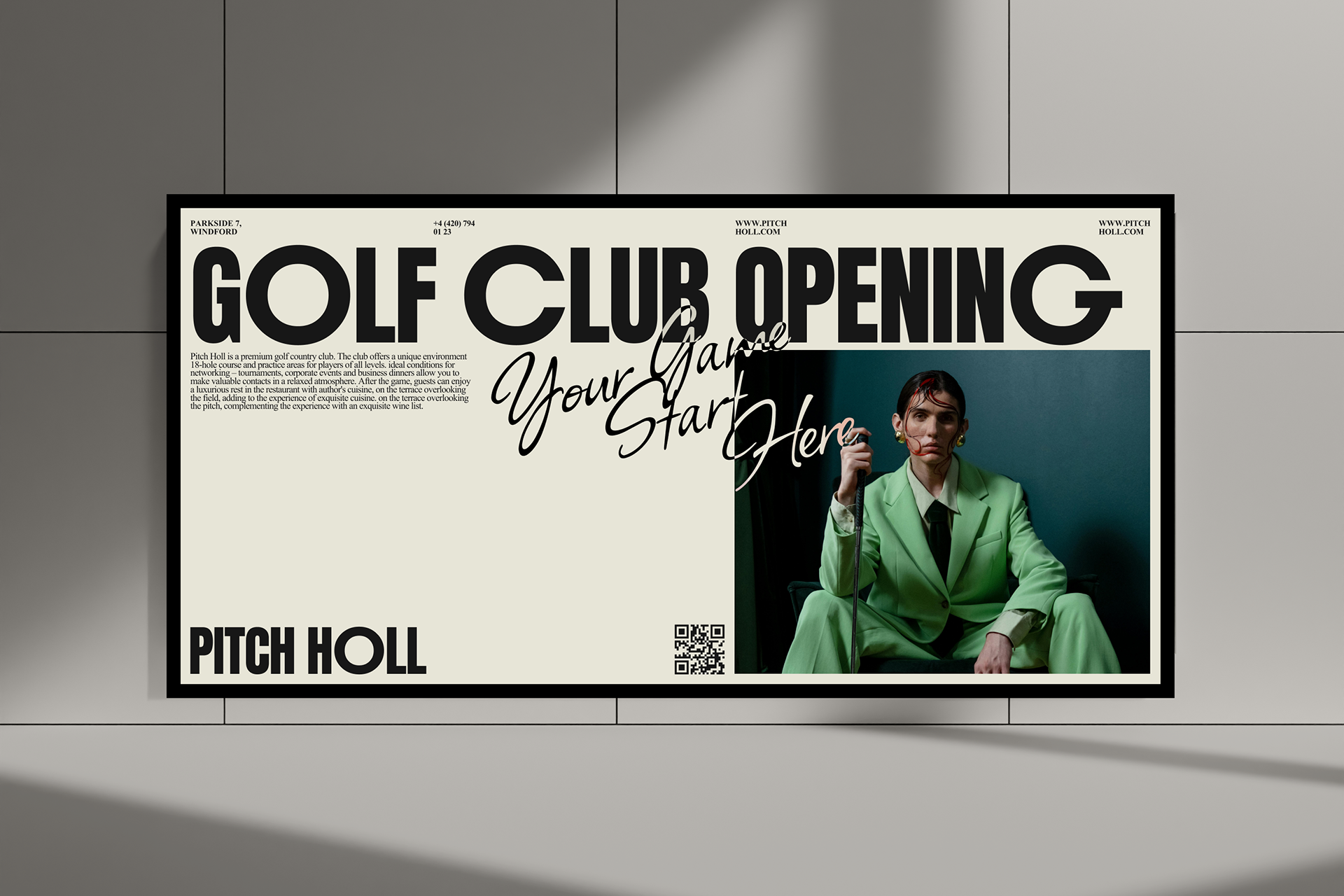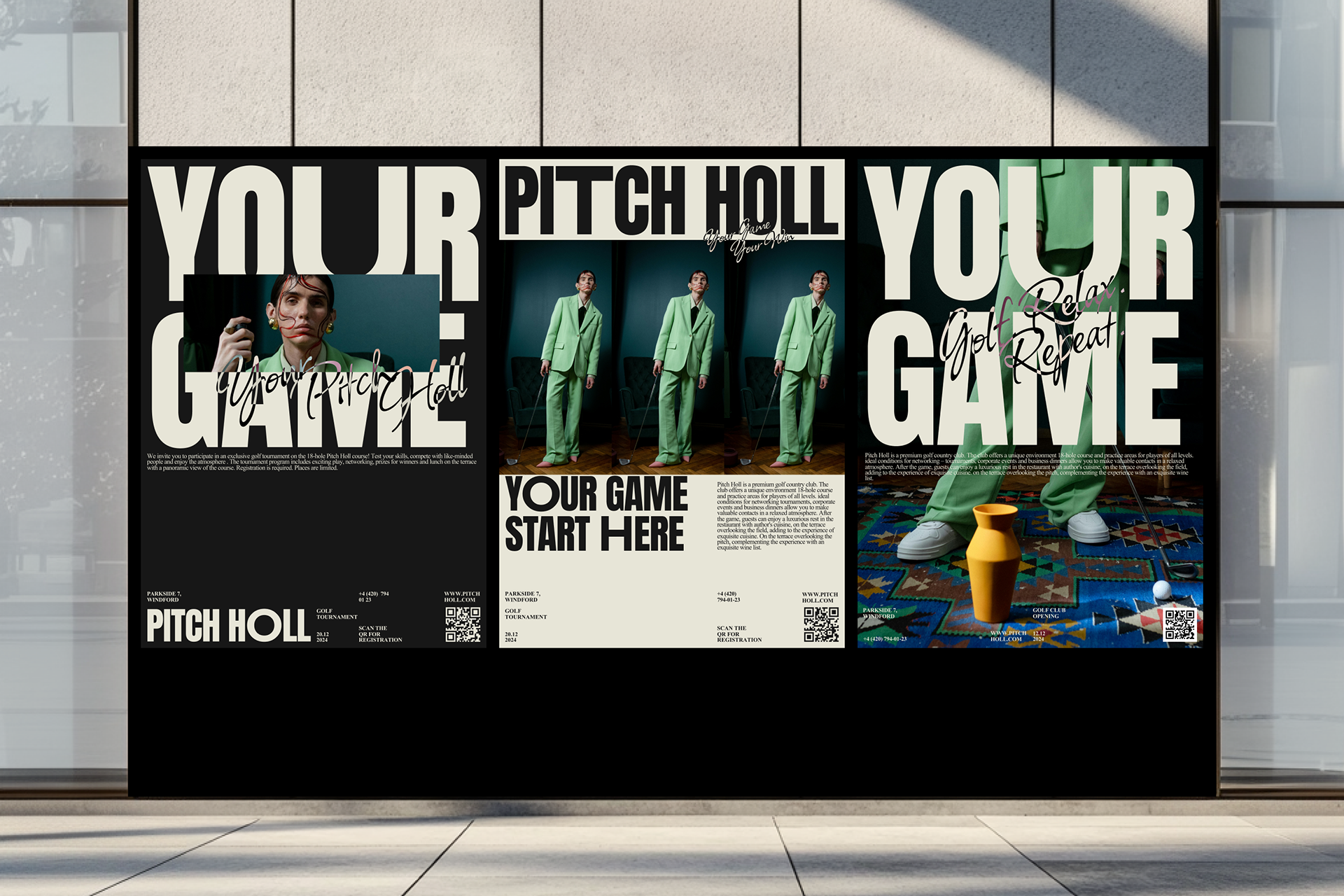 Название Pitch Holl идеально отражает суть гольфа. ПИТЧ — короткий удар, символизирует мастерство, и ХОЛЛ — лунка как цель, к которой стремится каждый игрок. Визуальный стиль был разработан с акцентом на мощную запоминающуюся типографику. Крупные, выразительные шрифты передают уверенность и энергетику игры. Темно-бежевая палитра подчеркивает премиальный характер клуба. Крупные надписи на упаковке сразу привлекают внимание и делают бренд легко узнаваемым. Мы решили сделать сайт клуба простым и интуитивно понятным, сделав акцент на крупной типографике и минималистичной навигации.